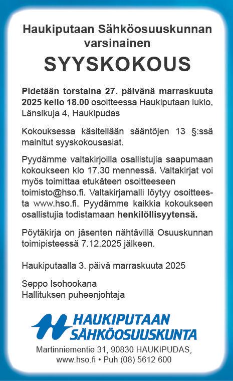 Pidetään torstaina 27. päivänä marraskuuta 2025 kello 18.00 osoitteessa Haukiputaan Lukio, Länsikuja 4, Haukipudas